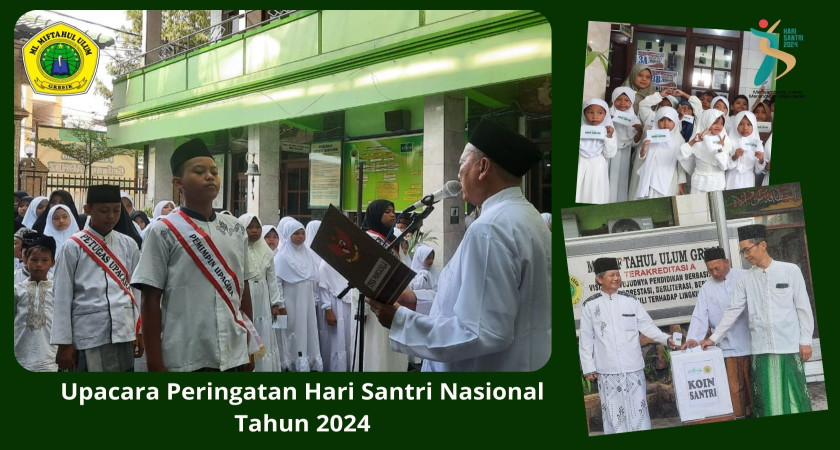 Bapak H. Muhammad Badri, S.H memimpin apel pagi di halaman MI. Miftahul Ulum Gresik pada hari Selasa (22/10/2024). Apel pagi kali ini dilaksanakan untuk memperingati Hari Santri Nasional 2024, seluruh siswa memakai busana muslim berwarna putih untuk siswa putri, sedangkan siswa putra memakai baju taqwa putih, bersarung dan berpeci. Tidak ketinggalan juga guru dan staff ikut serta memakai pakaian serupa. Petugas dari apel pagi kali ini dari siswa kelas 6. Pakaian yang berbeda tidak menghalangi mereka untuk berpartisipasi mengikuti kegiatan apel. Pada masanya, pakaian yang mereka kenakan merupakan simbol para santri dalam melawan penjajahan terutama peci dan sarung. Identitas pakaian para santri ini menjadi penyemangat untuk melawan Belanda dan menjadi bukti nyata bahwa santri ikut memperjuangkan kemerdekaan Indonesia.